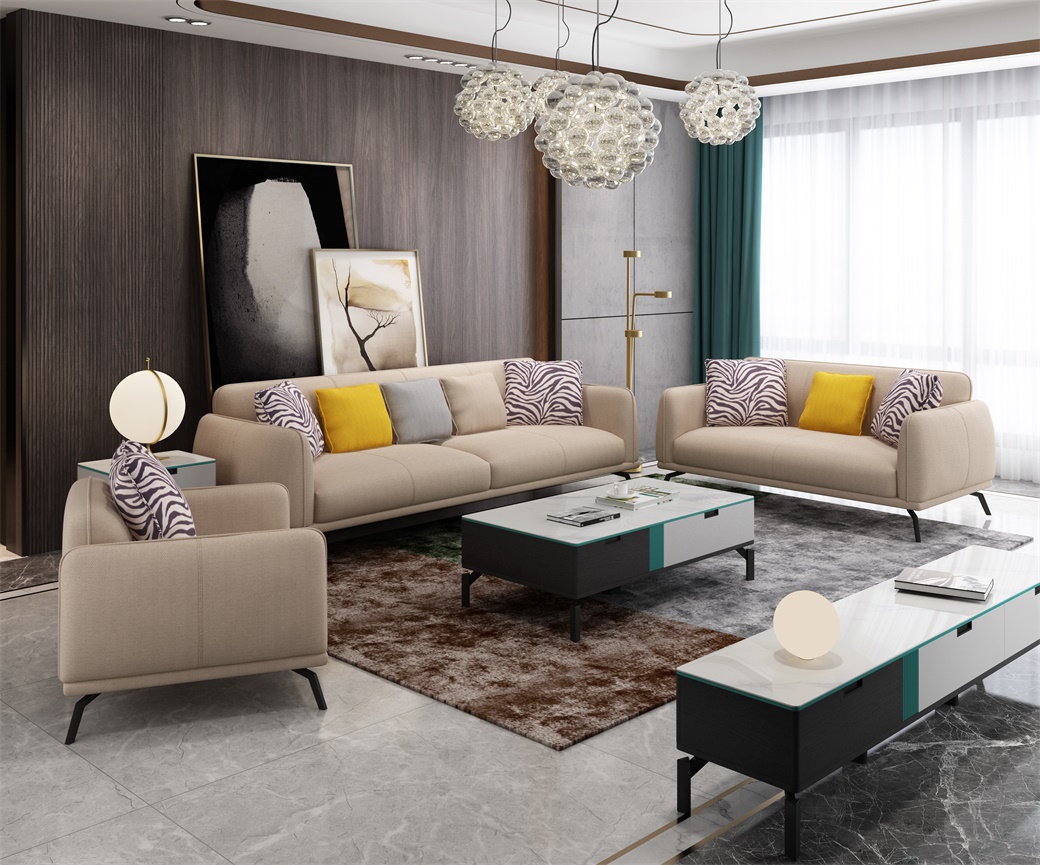 • 整套采用优质科技布料,靠包填充A+太空棉+抛光实木内架(桉木为主)+蛇形弹簧+高弹力橡筋+高密度纯海绵+喷镀五金脚
