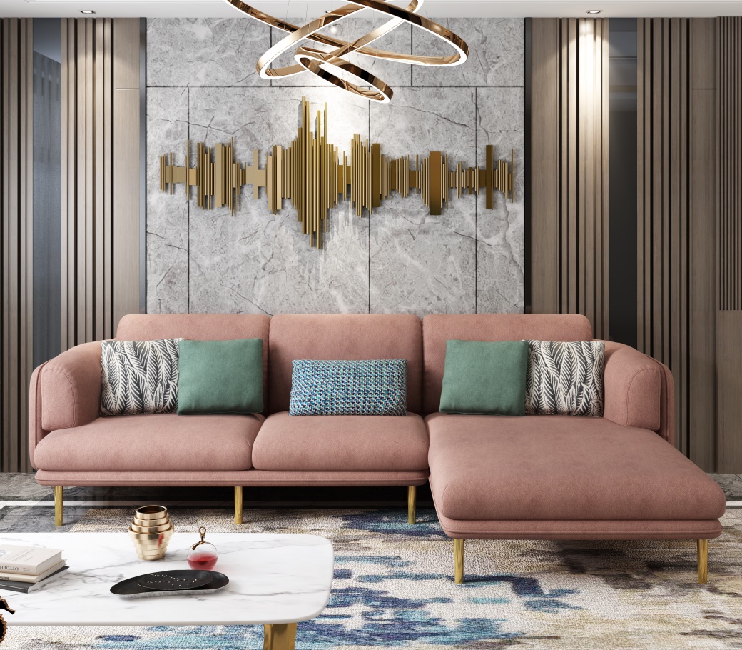 • 整套采用优质涤棉绒面布料,靠包,扶手包,抱枕填充A+太空棉,抛光实木内架(桉木为主)+蛇形弹簧+高弹力橡筋+高密度纯海绵+可拆装金色五金脚