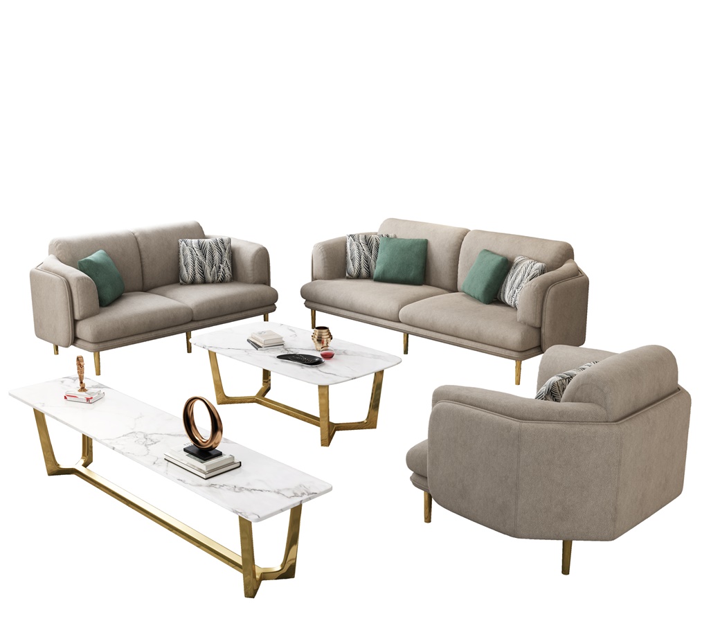 • 整套采用优质涤棉绒面布料,靠包,扶手包,抱枕填充A+太空棉,抛光实木内架(桉木为主)+蛇形弹簧+高弹力橡筋+高密度纯海绵+可拆装金色五金脚
