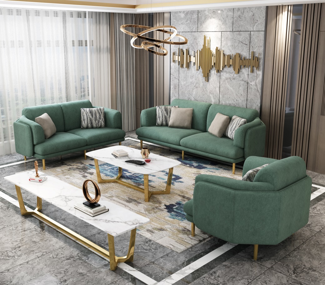 • 整套采用优质涤棉绒面布料,靠包,扶手包,抱枕填充A+太空棉,抛光实木内架(桉木为主)+蛇形弹簧+高弹力橡筋+高密度纯海绵+可拆装金色五金脚