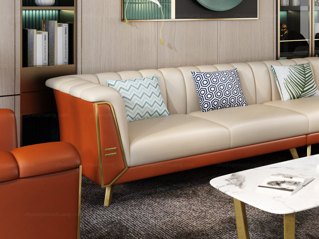 底框架优质亮光加密仿皮,人体接触面优质亮光仿真皮-超纤皮(坐包面,坐包前,扶手面,靠背面),抱枕涤棉布料填充A+太空棉,抛光实木内架(桉木为主)+蛇形弹簧+高弹力橡筋+高密度纯海绵+扶手镶钛金五金+可拆装镀金五金脚