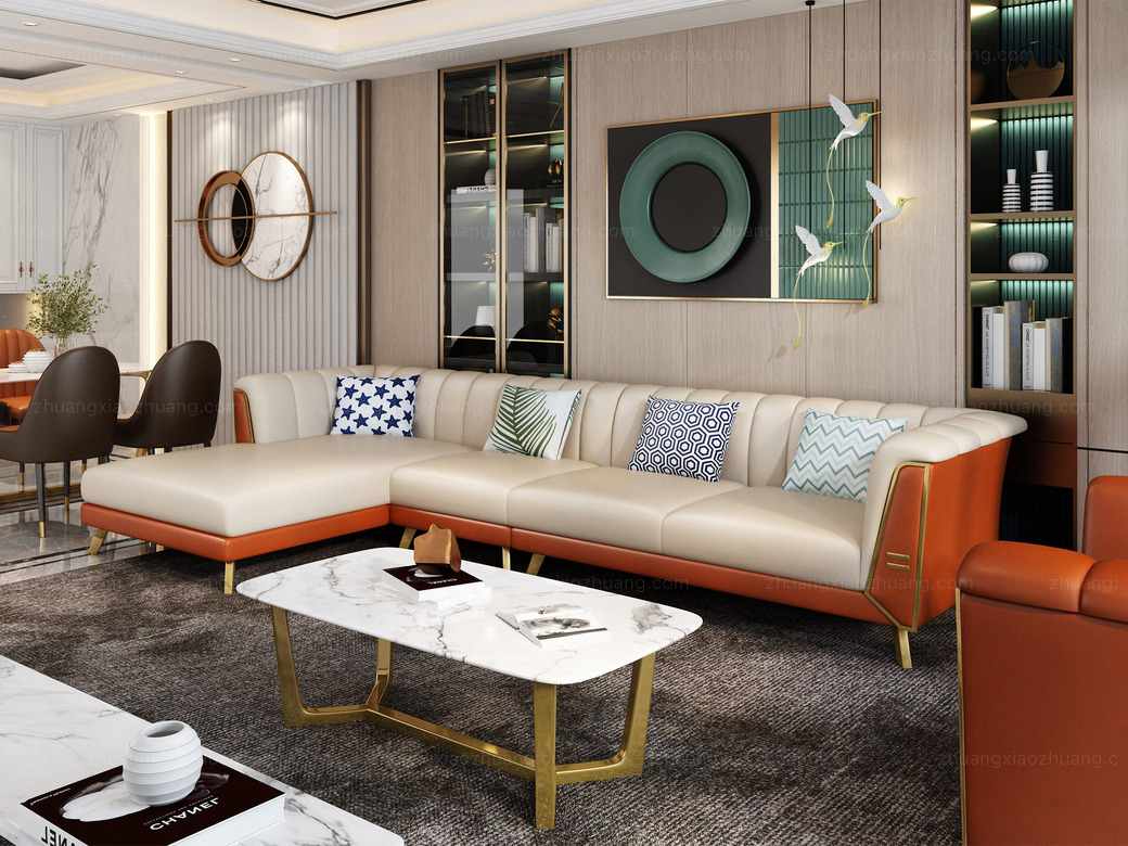 底框架优质亮光加密仿皮,人体接触面优质亮光仿真皮-超纤皮(坐包面,坐包前,扶手面,靠背面),抱枕涤棉布料填充A+太空棉,抛光实木内架(桉木为主)+蛇形弹簧+高弹力橡筋+高密度纯海绵+扶手镶钛金五金+可拆装镀金五金脚