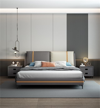 【品上佳】 极简风格 面料:牛皮绒(金刚皮) 靠包填充:海棉 框架:松木 床边床尾:整块松木 配静音床板 1.5米床