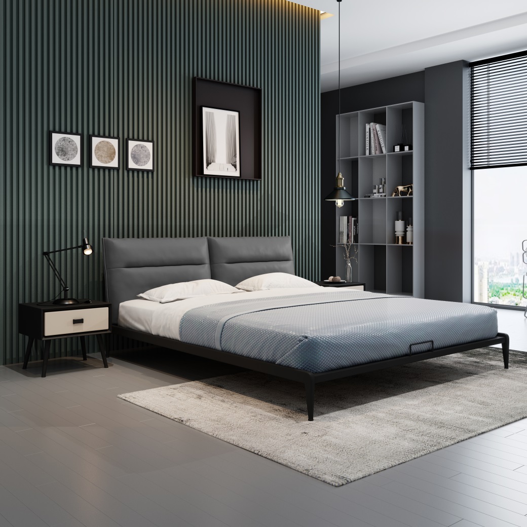 • 床头接触面头层牛皮+仿皮;床身为碳素钢架(盐雾测试10级);加强型实木拆装排骨架