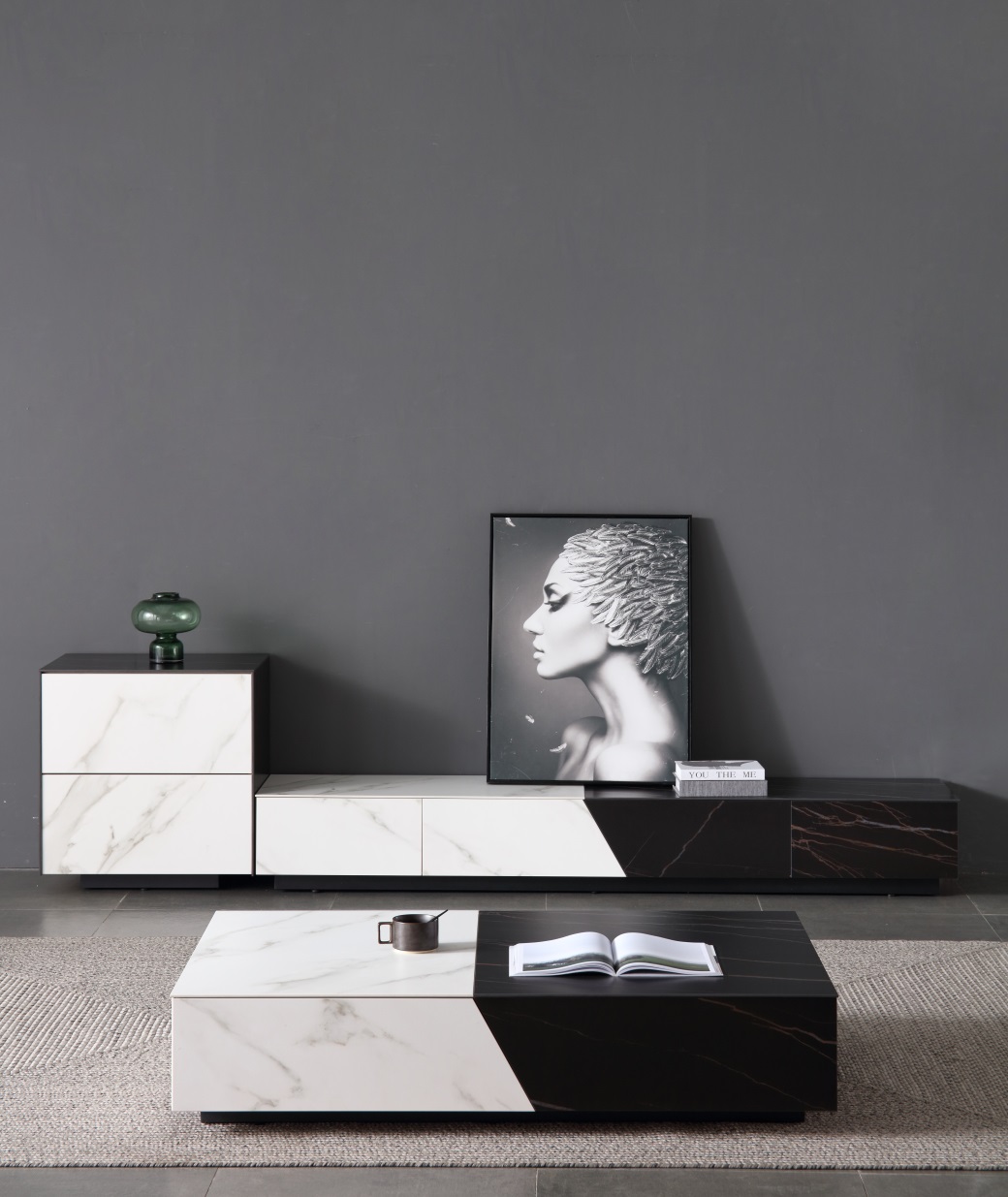 【里奥】极简 全岩板台面+缓冲导轨,实木框架+碳素钢脚架 2.4米高脚电视柜
