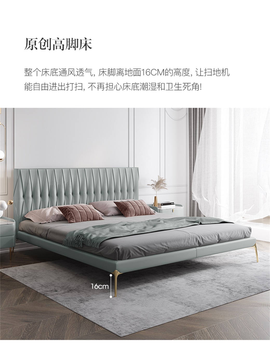 【简奢家】轻奢 接触面真皮+高密度海棉+全实木内架+不锈钢五金脚 1.5米床