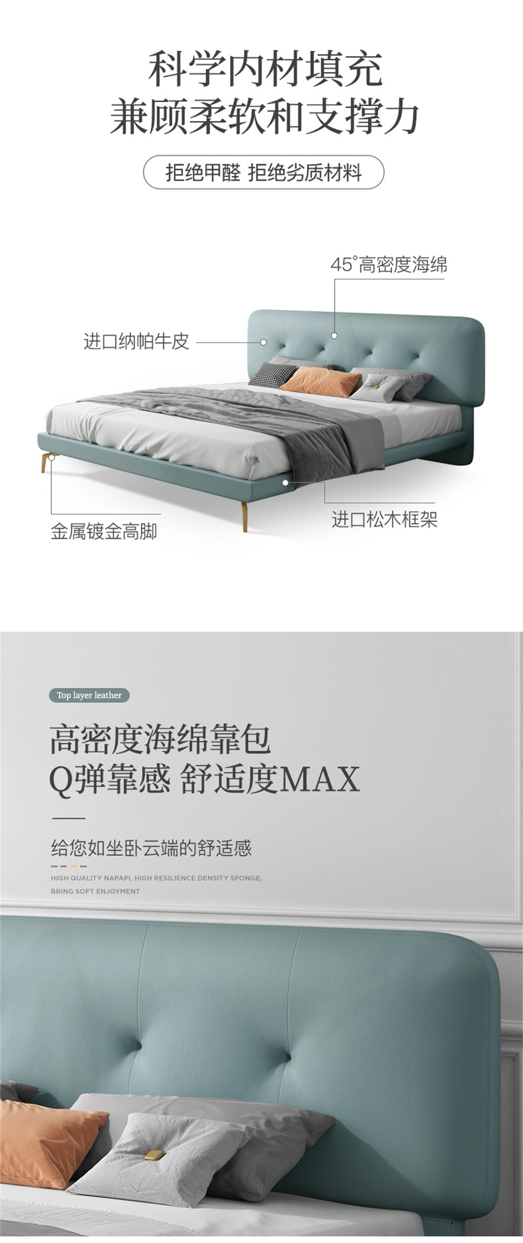 【简奢家】轻奢 接触面真皮+高密度海棉+全实木内架+不锈钢五金脚 1.5米床