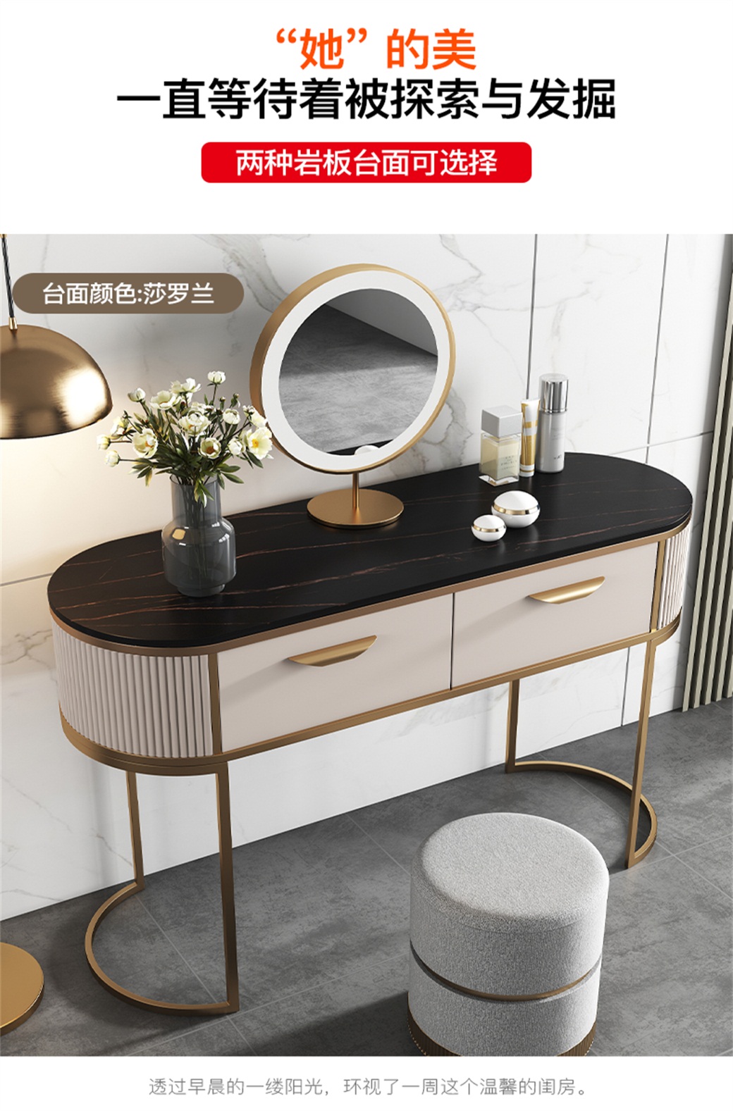 【简奢家】轻奢 岩板+钢琴烤漆+坚纹浮雕工艺+不锈钢镀金 1.2米妆台+妆镜+妆凳组合