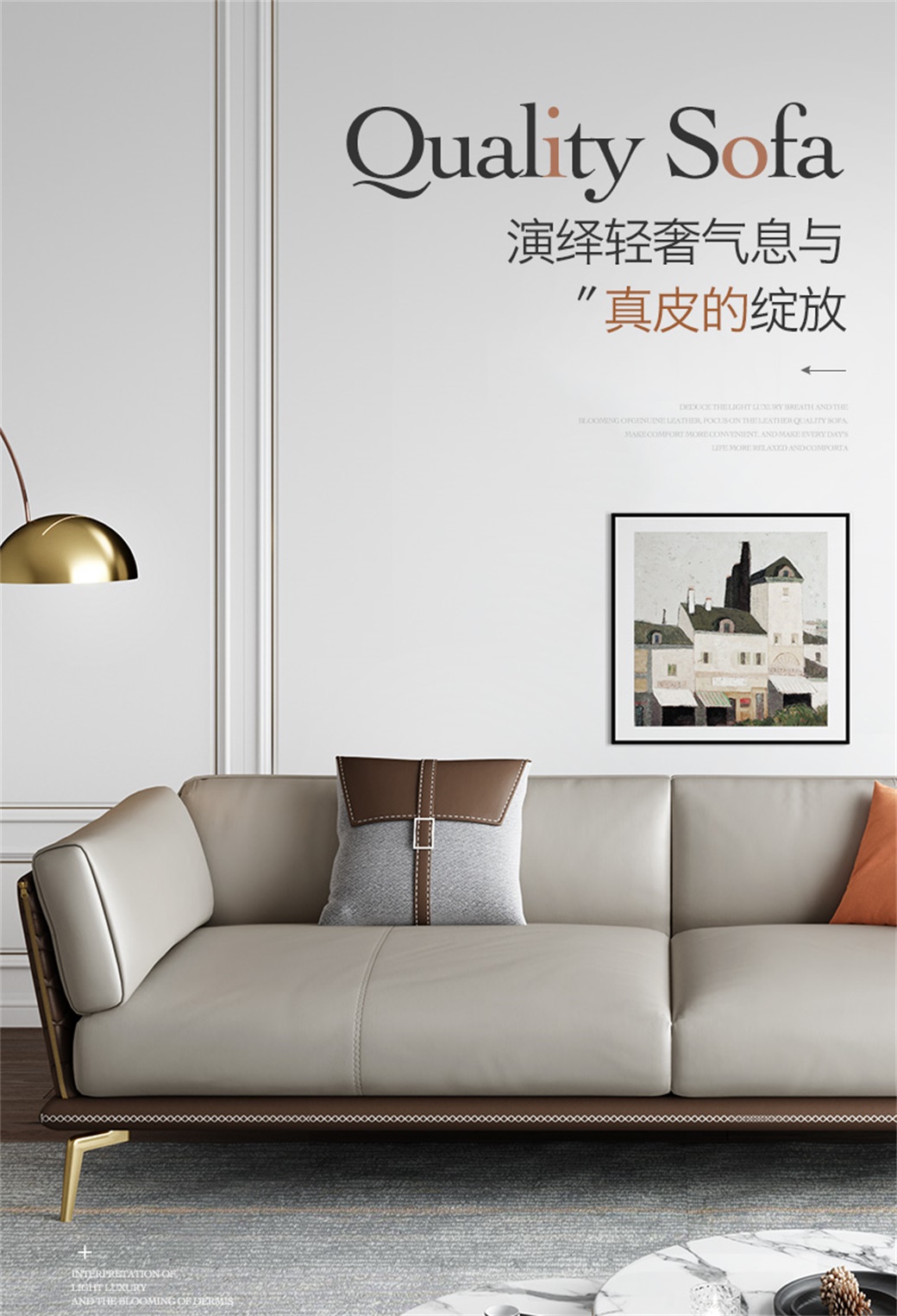 材质:全实木框架松木+羽绒公仔包+鹅绒靠包+不锈钢渡金脚+高密海棉整块坐垫