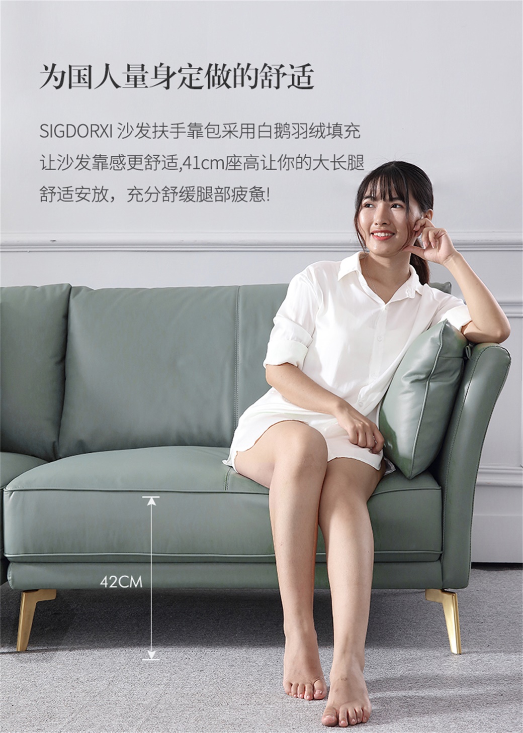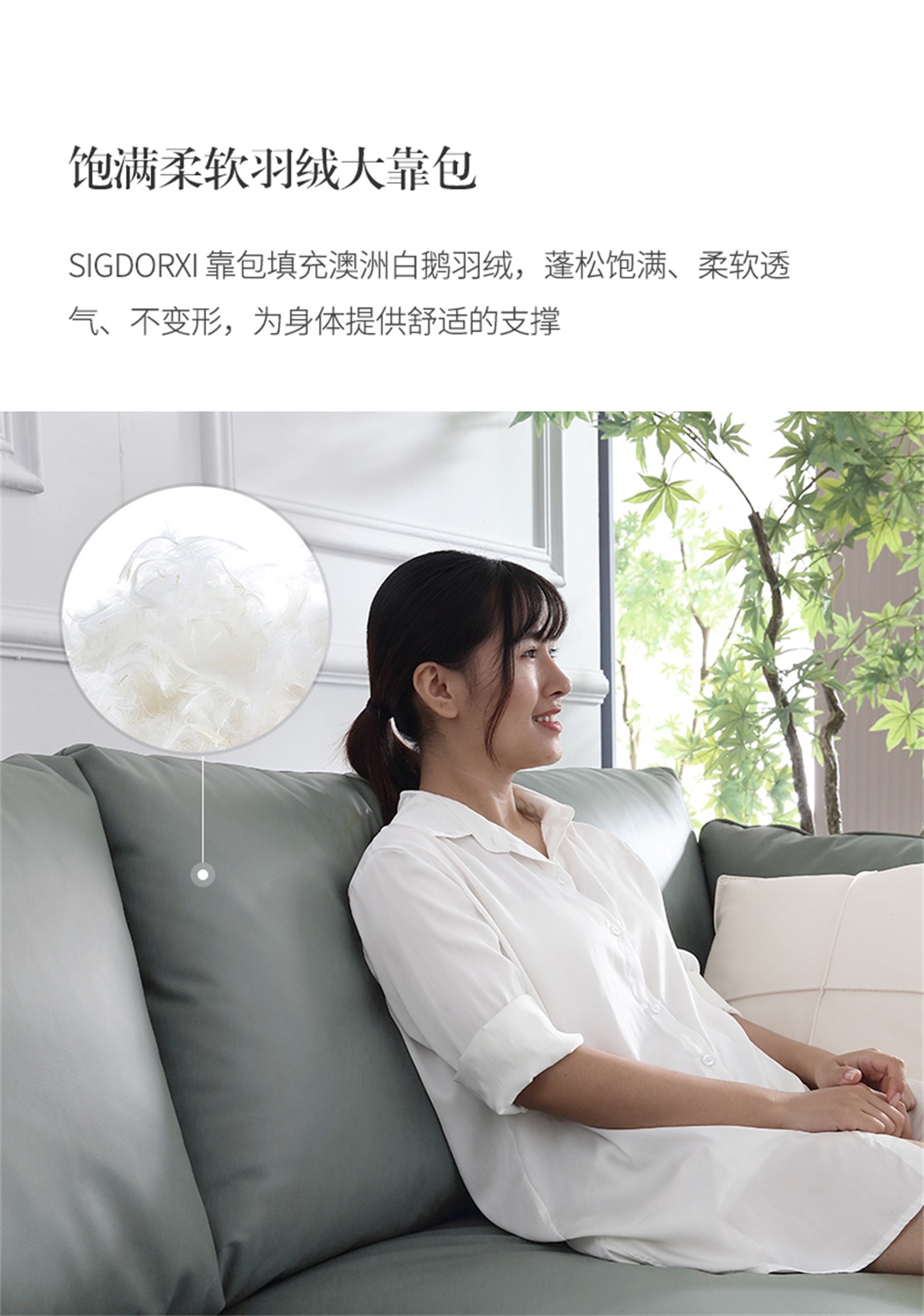全实木框架松木+鹅绒靠包+羽绒公仔包+不锈钢渡金脚+高密海棉整块坐垫