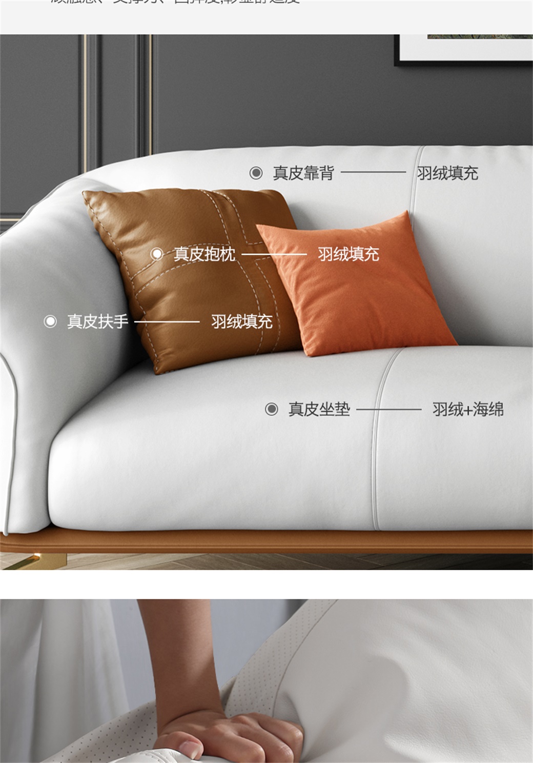材质:实木内架+高密度海棉+鹅绒靠包+不锈钢五金脚