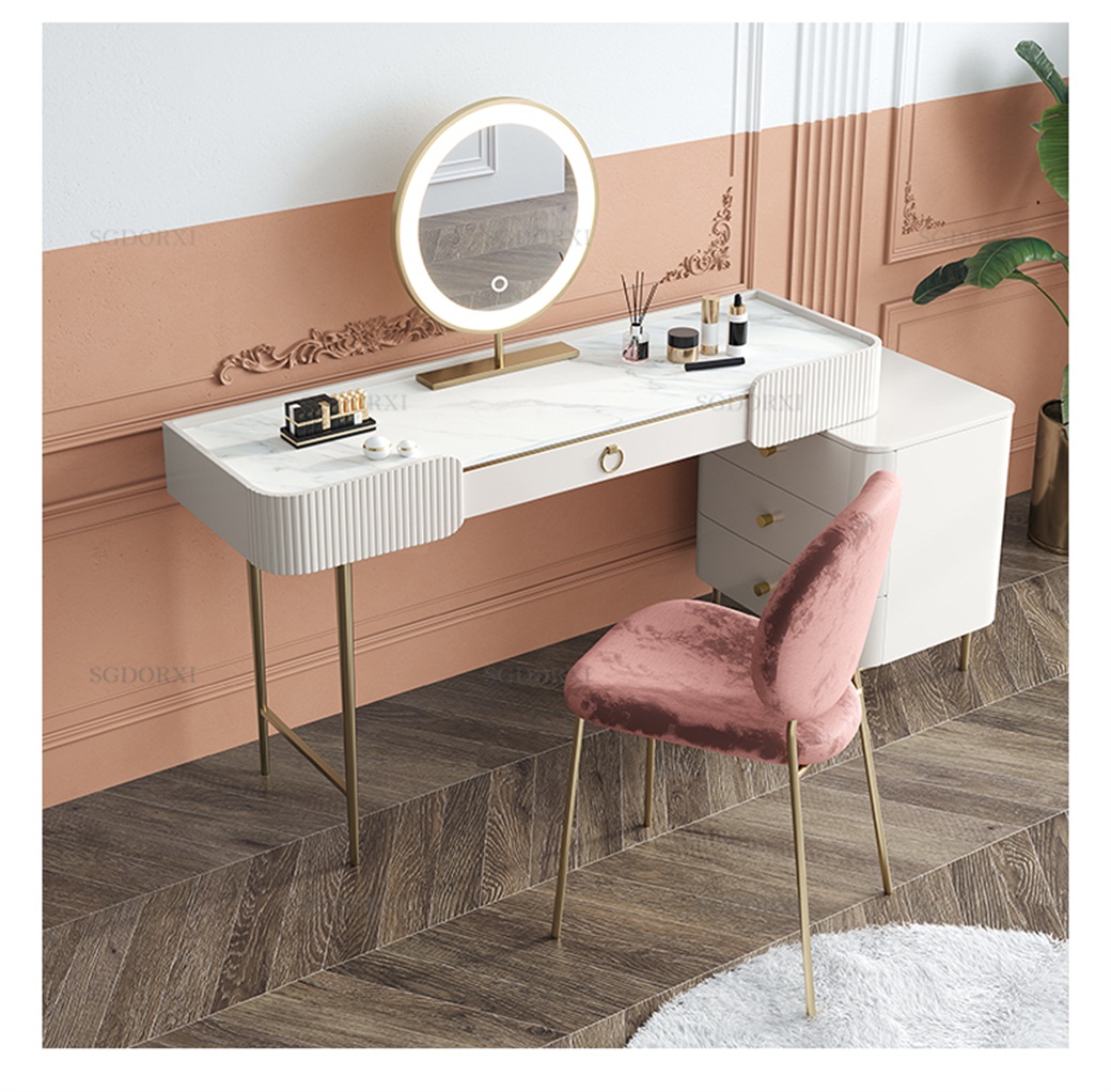 【简奢家】轻奢 岩板+坚条浮雕工艺+水性烤漆板+不锈钢镀金脚 妆台+柜子+妆凳+镜子