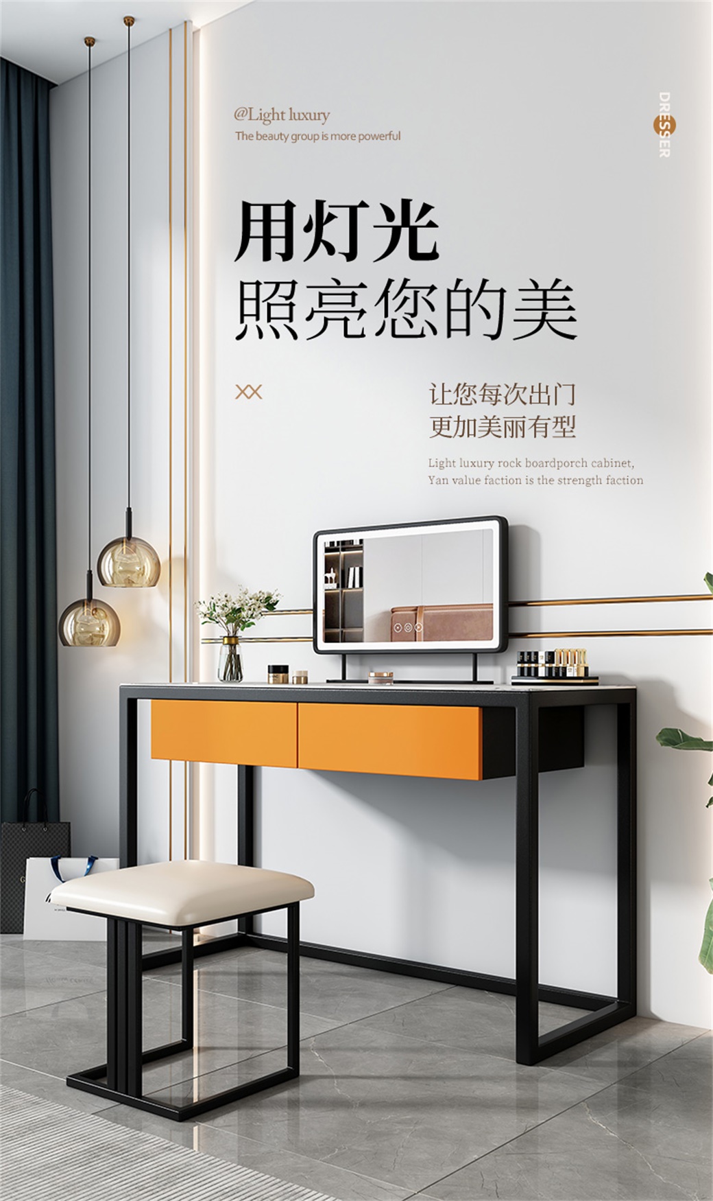 【简奢家】极简 岩板+E1级密度板+实木抽屉+碳素钢底架 妆镜+妆台+妆凳