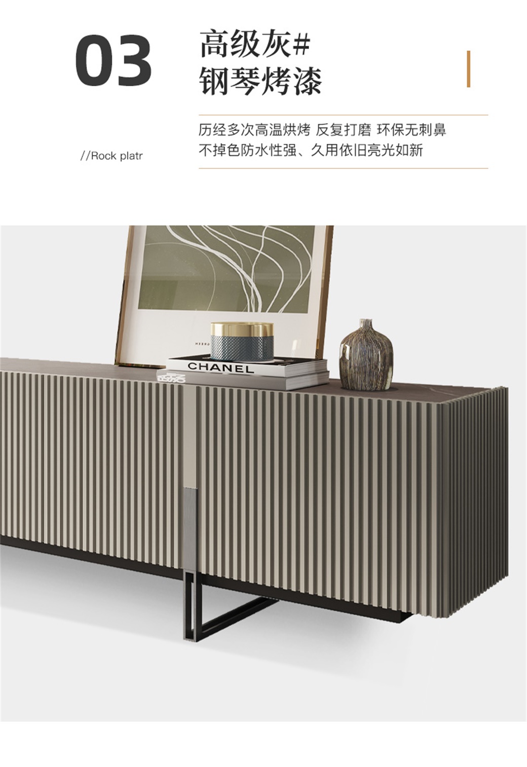• 岩板+浮雕工艺+钢琴烤漆高级灰+不锈钢灰钢