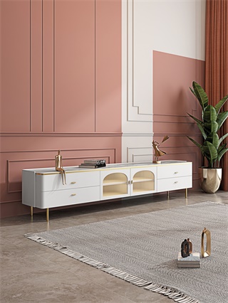 材质:MDF面板亮光烤漆+不锈钢镀金+6mm岩板