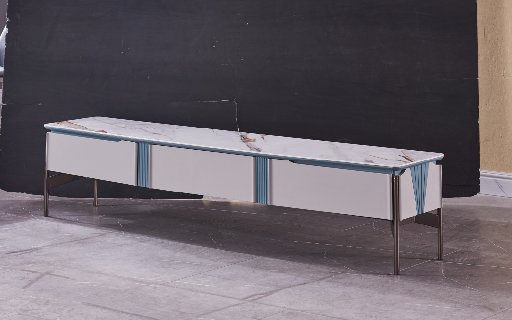 【沐玖】极简 碳素钢棕灰脚架+板木结合+6里卡拉拉金丝白岩板 电视柜