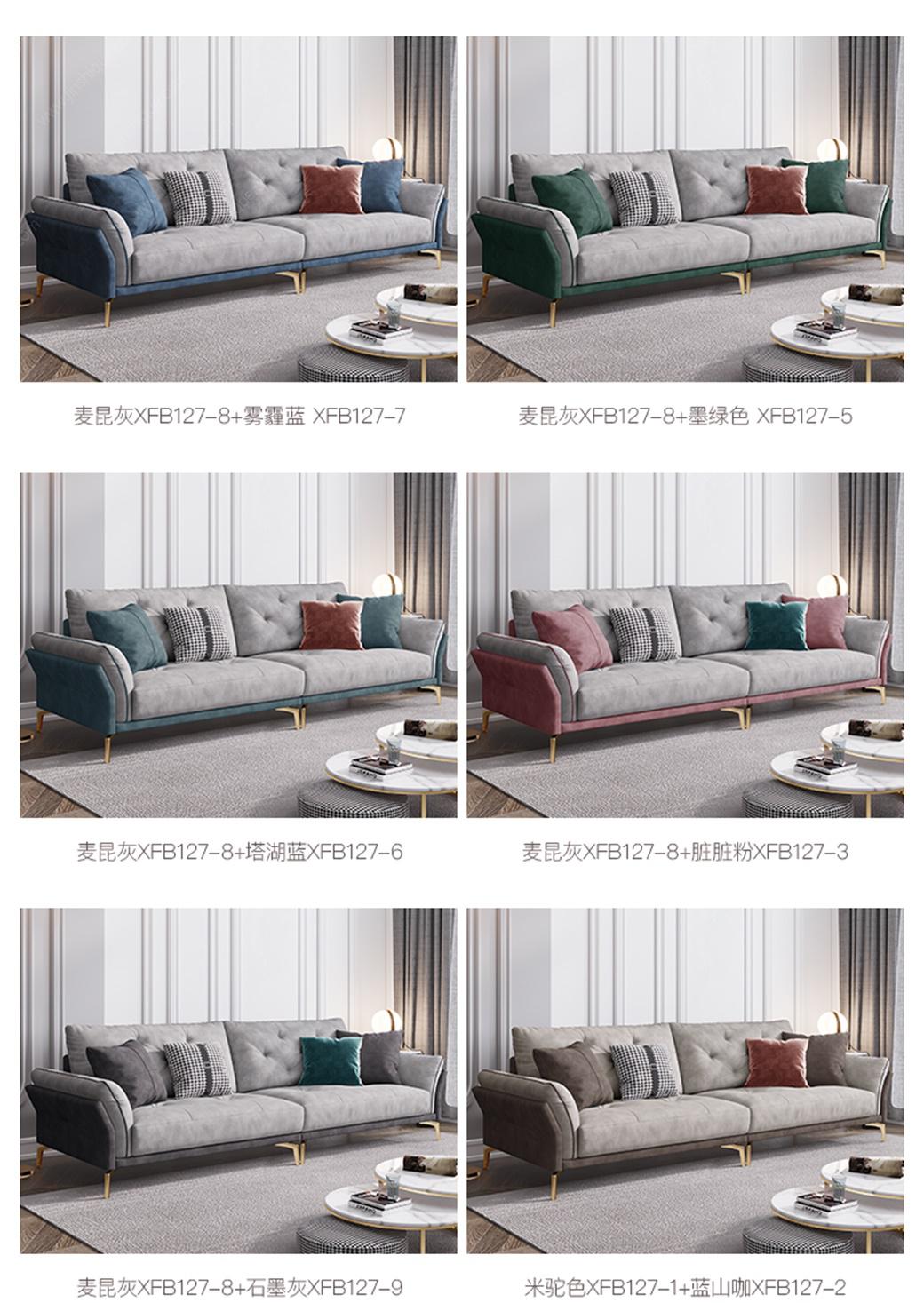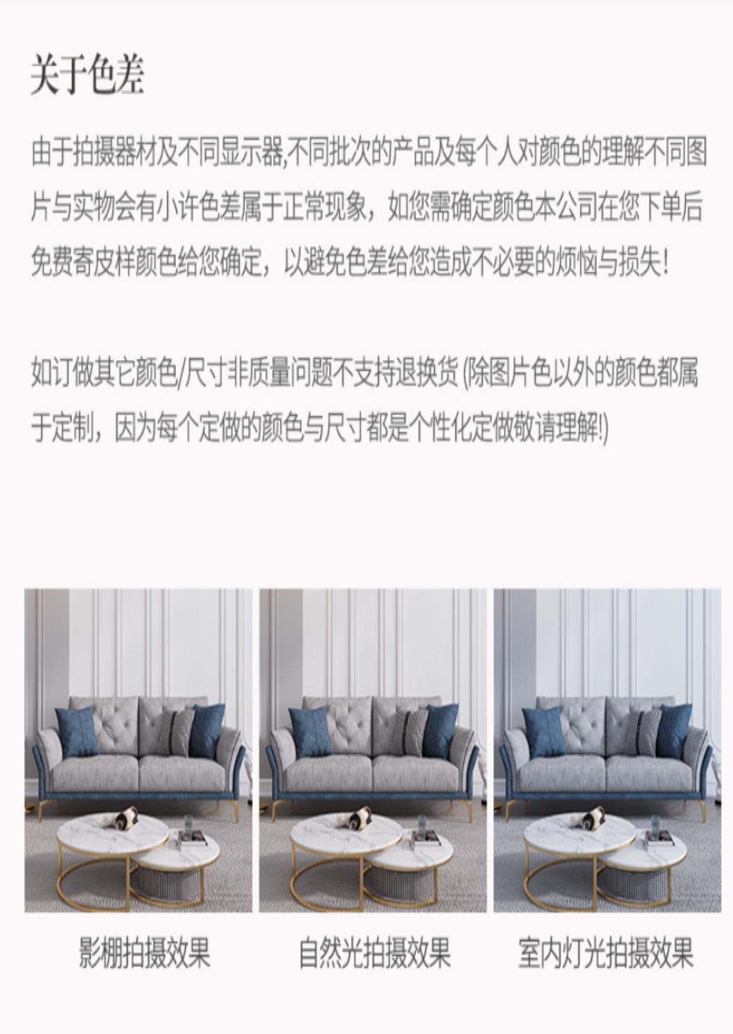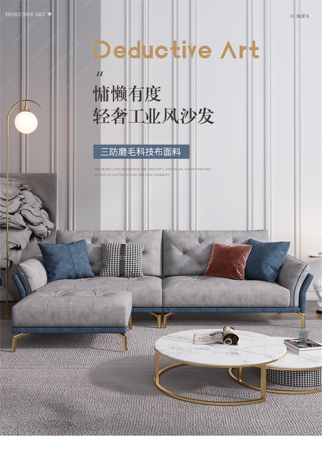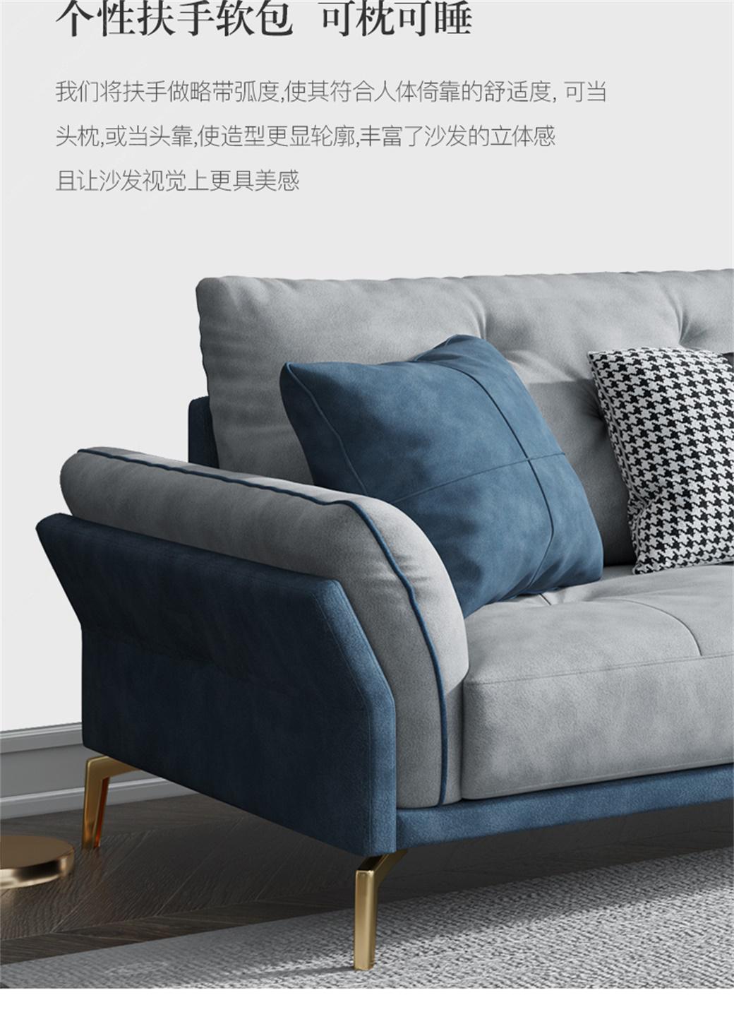 材质:接触面仿真皮/科技布+实木内架+抱枕羽绒+公仔棉+东亚海棉+镀金脚