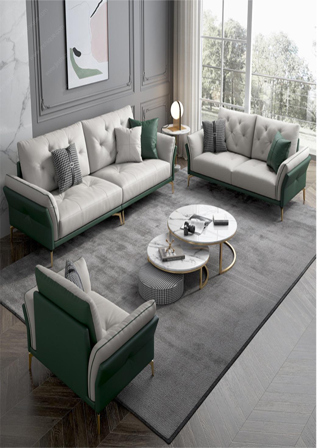 【乐迪】轻奢 接触面仿真皮/科技布+实木内架+抱枕羽绒+公仔棉+东亚海棉+镀金脚 米灰色+墨绿色 双人位沙发