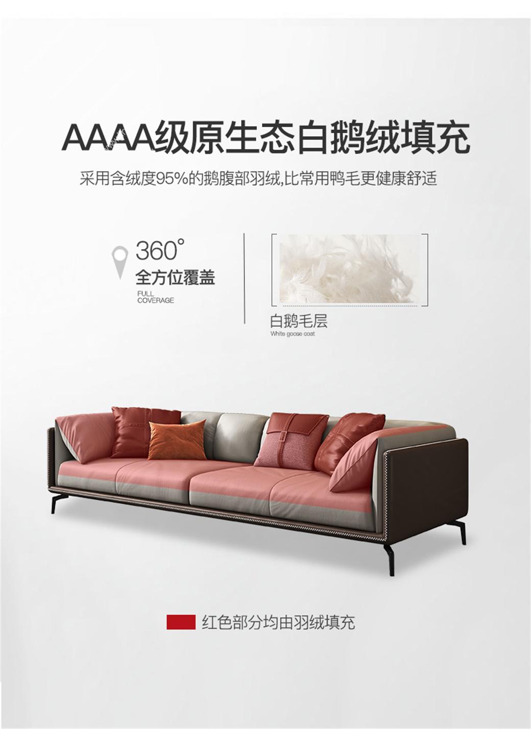 • 接触面仿真皮+高密度海棉+羽绒+实木内架+碳素钢脚