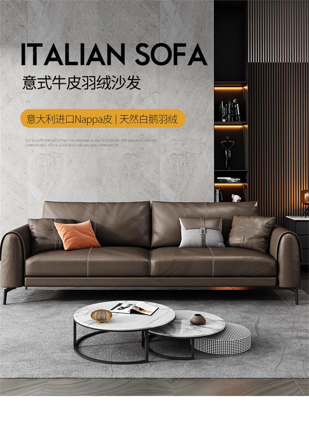 • 接触面真皮+高密度海棉+白鹅羽绒靠包+全实木内架+碳素钢脚(只做真皮,不做仿真皮