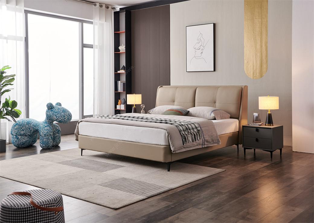 【洛梵】极简 头层真皮+全实木框架+高密度海绵填充+钢木排骨架+黑色五金脚 1.5米真皮床