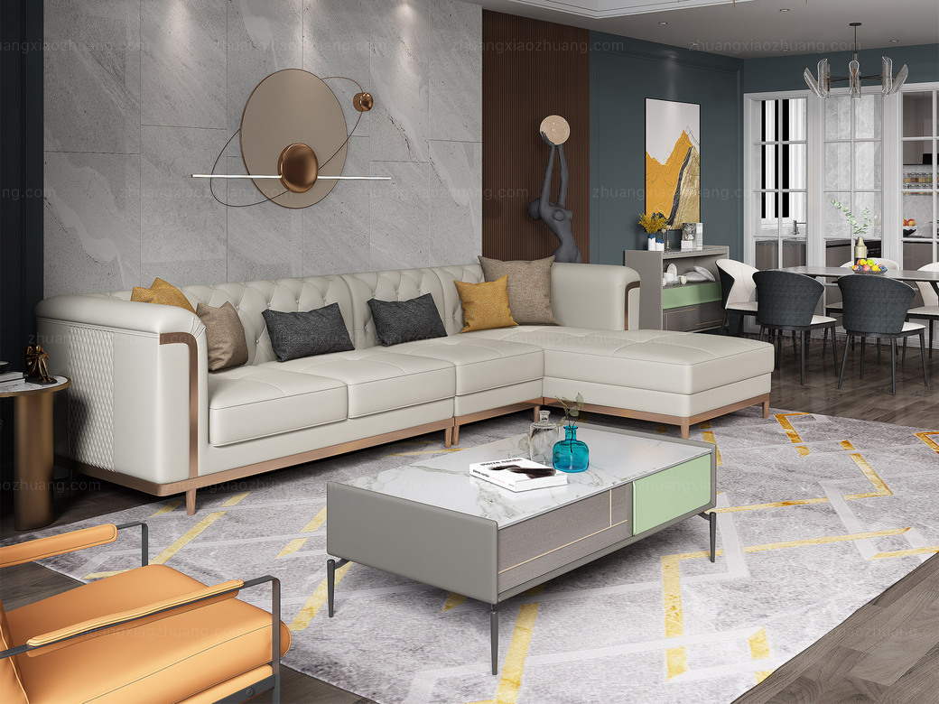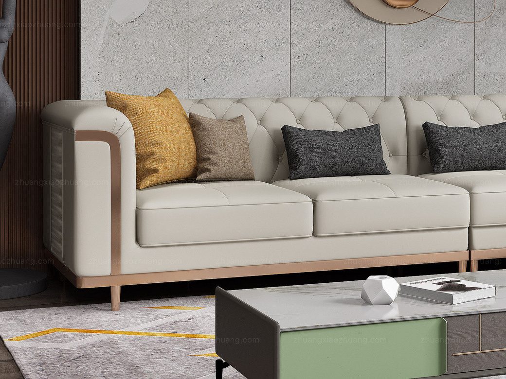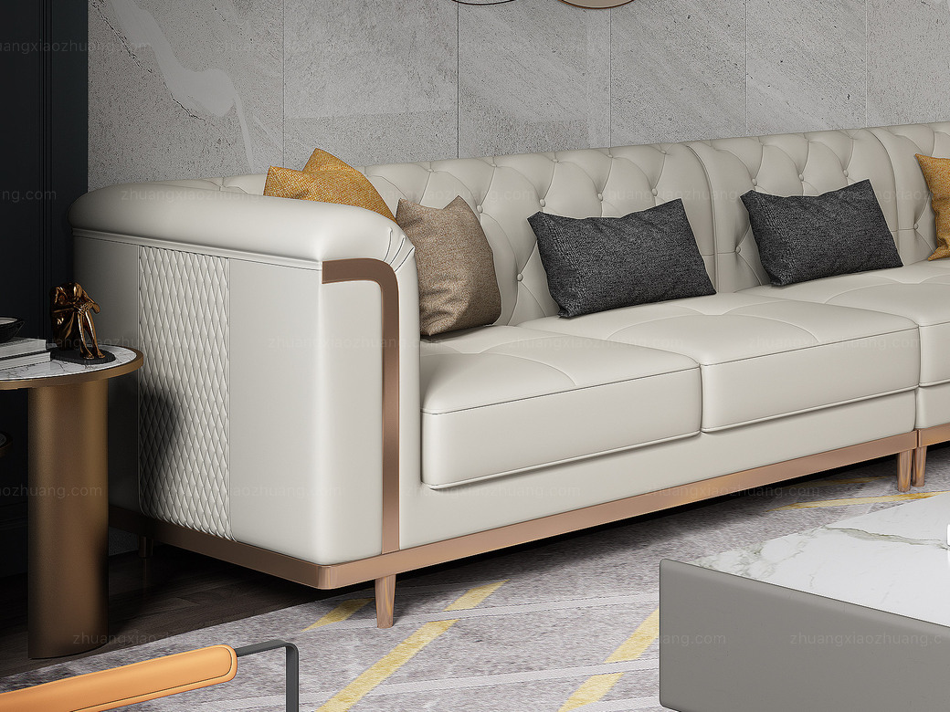 【极致生活】轻奢奢华大气,优质黄牛真皮沙发,真皮拉扣,扶手镶钛合金,钛合金底框架结构,可拆装钛合金脚,1+3+左贵妃