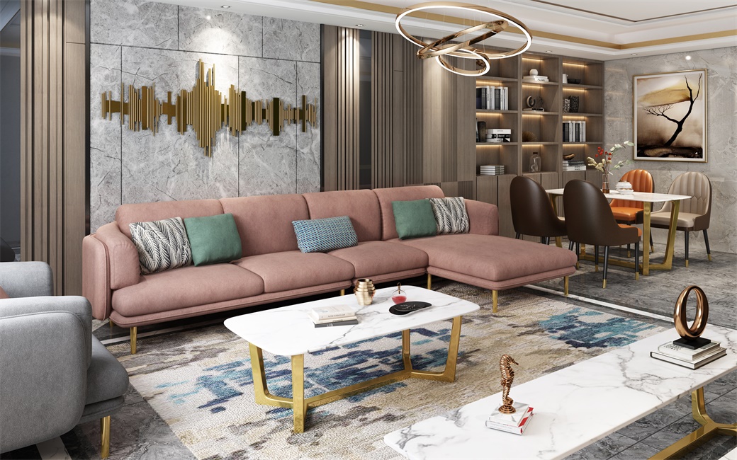 • 整套采用优质涤棉绒面布料,靠包,扶手包,抱枕填充A+太空棉,抛光实木内架(桉木为主)+蛇形弹簧+高弹力橡筋+高密度纯海绵+可拆装金色五金脚