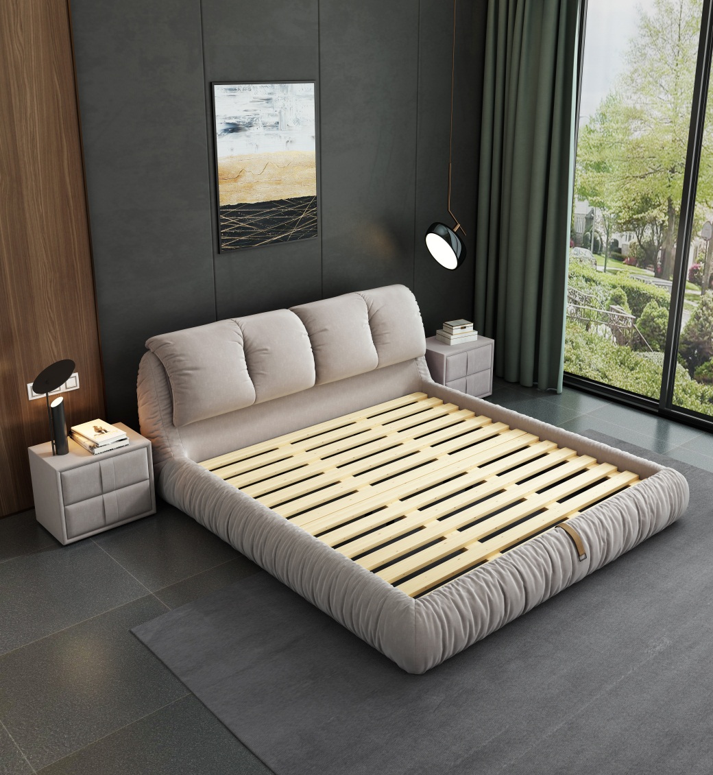 【品上佳】 极简 面料:科技绒;靠包填充:公仔棉;床头框架:全松木;床边床尾:全松木+实木多层板;床板:1.8cm厚10cm宽;防水等级:中级 1.5米床
