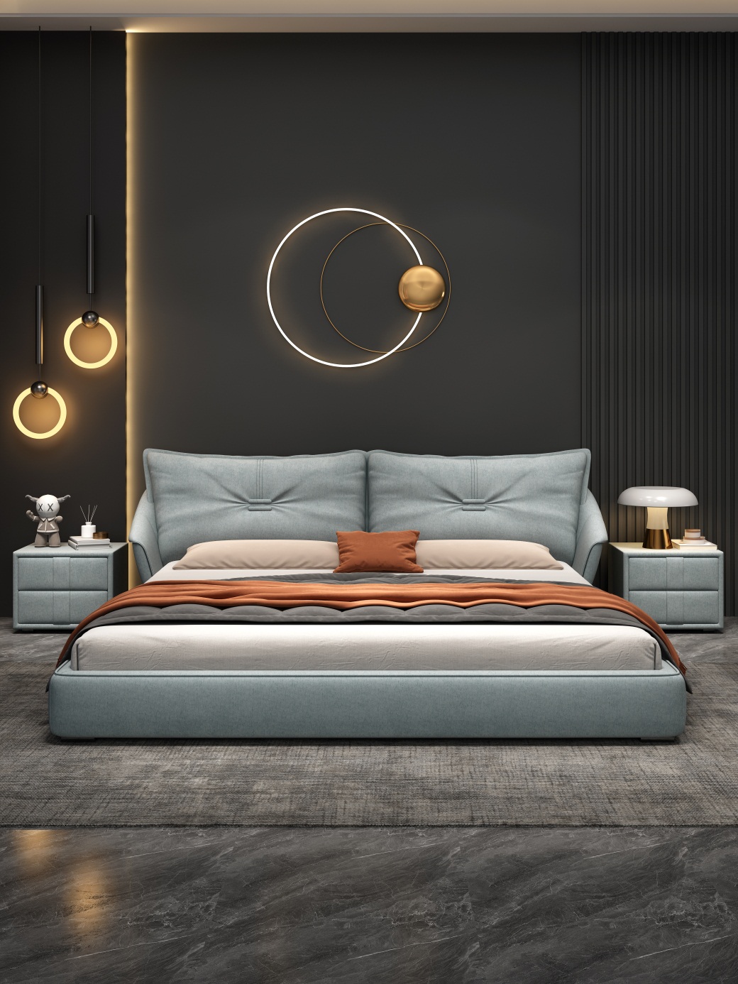 【品上佳】 极简 面料:科技绒;靠包填充:公仔棉+羽绒;床头框架:全松木;床边床尾:全松木+实木多层板;床板:1.8cm厚10cm宽;防水等级:中级 1.8米床