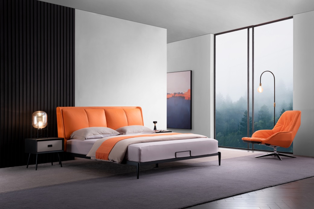• 床头接触面头层牛皮+仿皮;床身床身为碳素钢架(盐雾测试10级);加强型实木拆装排骨架