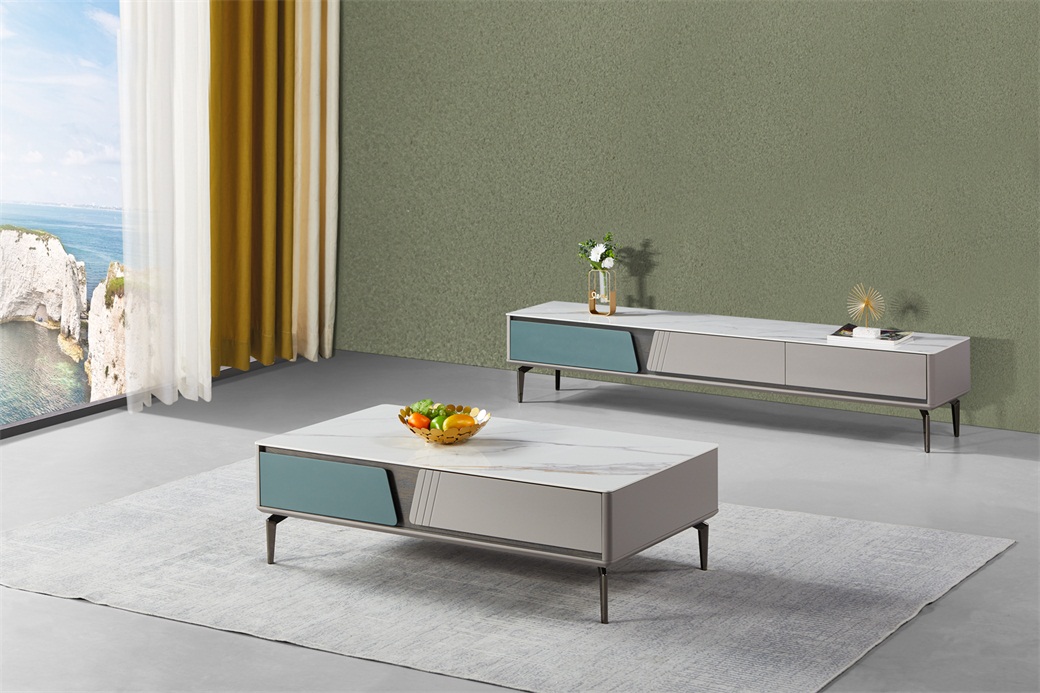 【里奥】极简 碳素钢+纤维板贴木皮+烤漆+哑光雪山石岩板 2米电视柜
