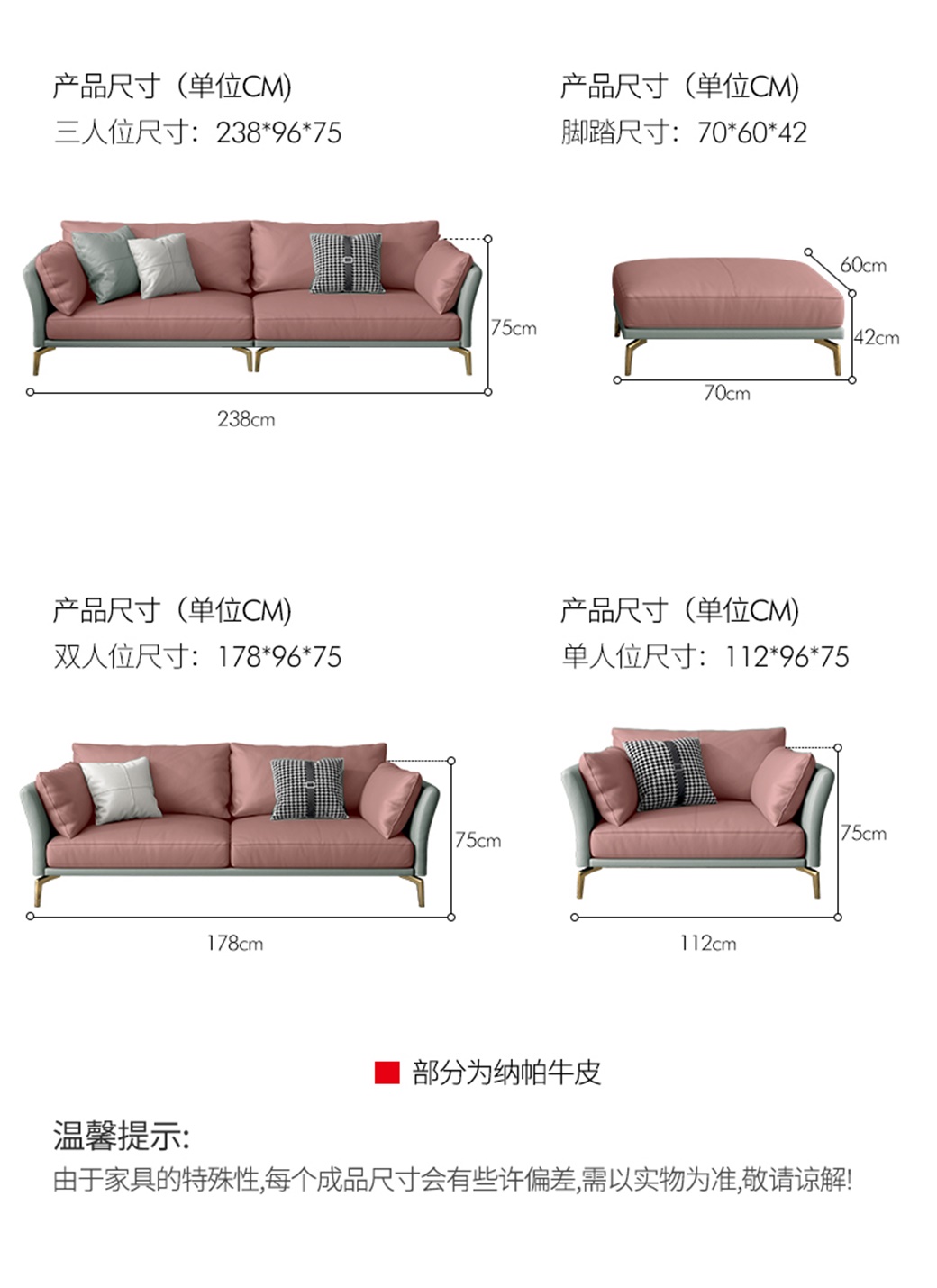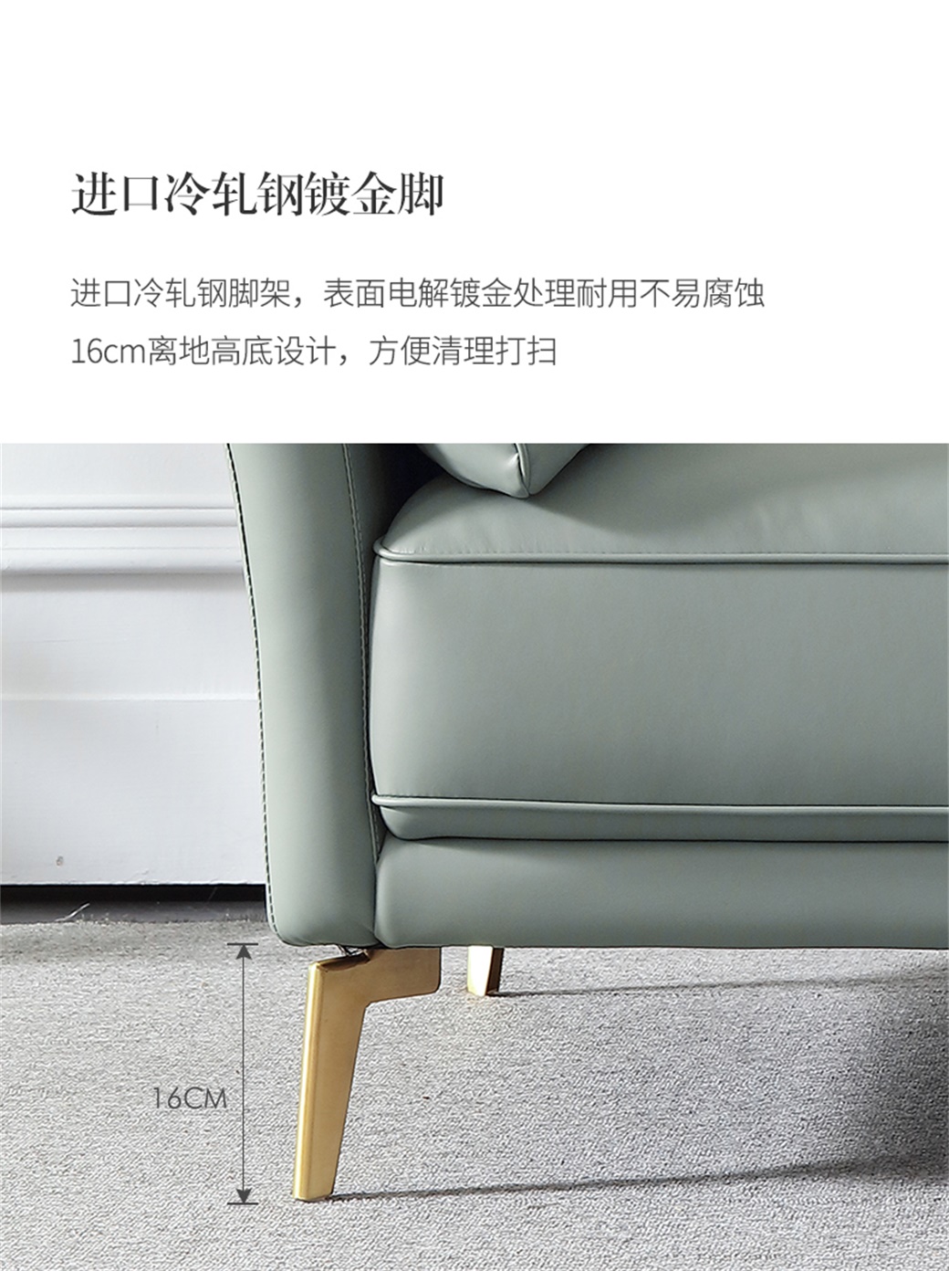 全实木框架松木+鹅绒靠包+羽绒公仔包+不锈钢渡金脚+高密海棉整块坐垫