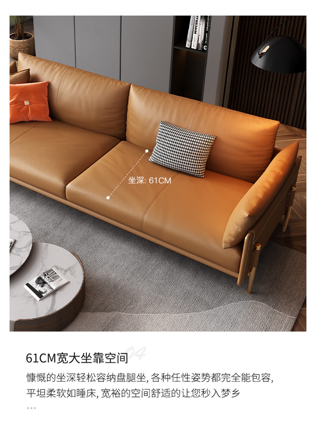 • 接触面真皮+高密度海棉+白鹅羽绒靠包+全实木内架+碳素钢脚