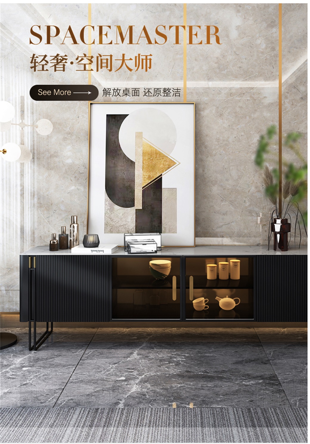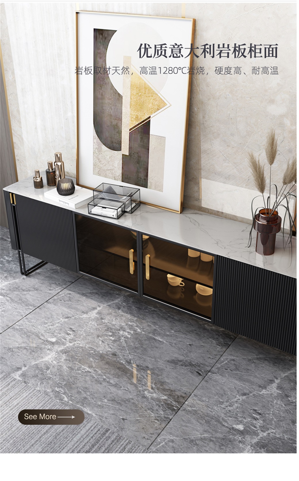 • 岩板台面+钢琴烤漆+实木抽屉+无线智能感应灯+五金底架(黑色/白色)