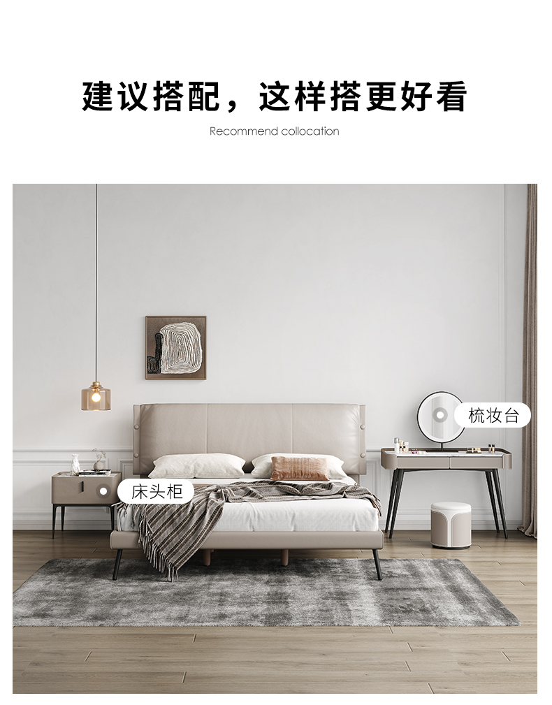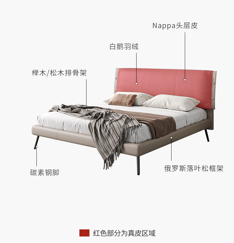 【简奢家】极简 纳帕头层真皮+高密度海棉+白鹅羽绒+俄罗斯进口落叶松内架+碳素钢脚脚+10分松木钢木排骨架 1.8米床
