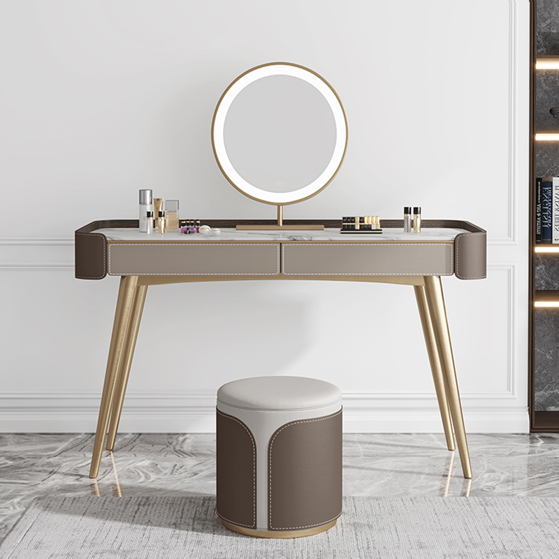 【简奢家】轻奢 岩板+烟熏木纹+马鞍皮+不锈钢镀金+LED智能镜 妆台+妆凳+镜子