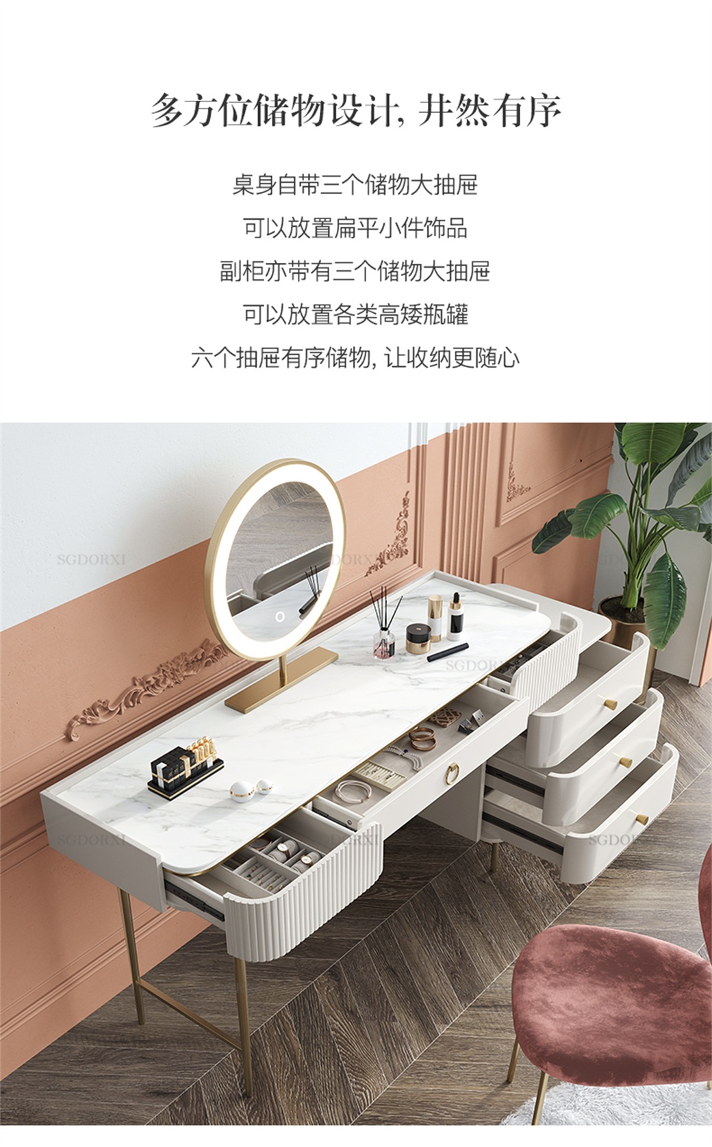 【简奢家】轻奢 岩板+坚条浮雕工艺+水性烤漆板+不锈钢镀金脚 妆台+柜子+妆凳+镜子