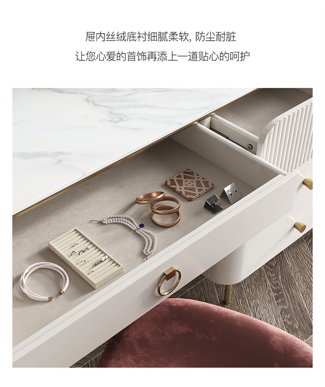 【简奢家】轻奢 岩板+坚条浮雕工艺+水性烤漆板+不锈钢镀金脚 妆台+柜子+妆凳+镜子