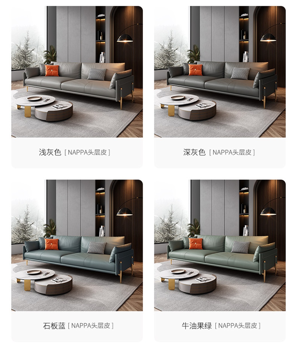 • 纳帕头层真皮+高密度海棉+白鹅羽绒靠包+全实木内架+碳素钢脚