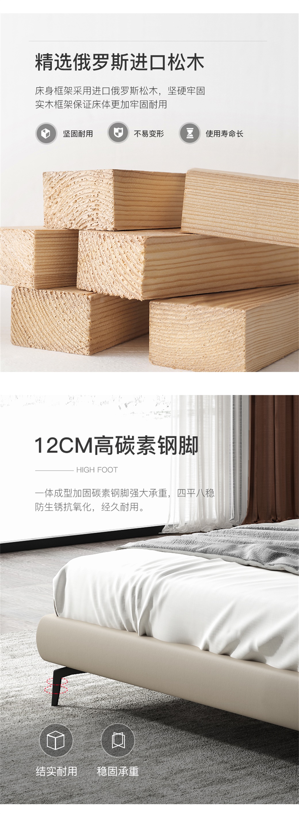 【简奢家】极简 接触面仿真皮+高密海棉+全实木内架+碳素钢脚 1.5米床