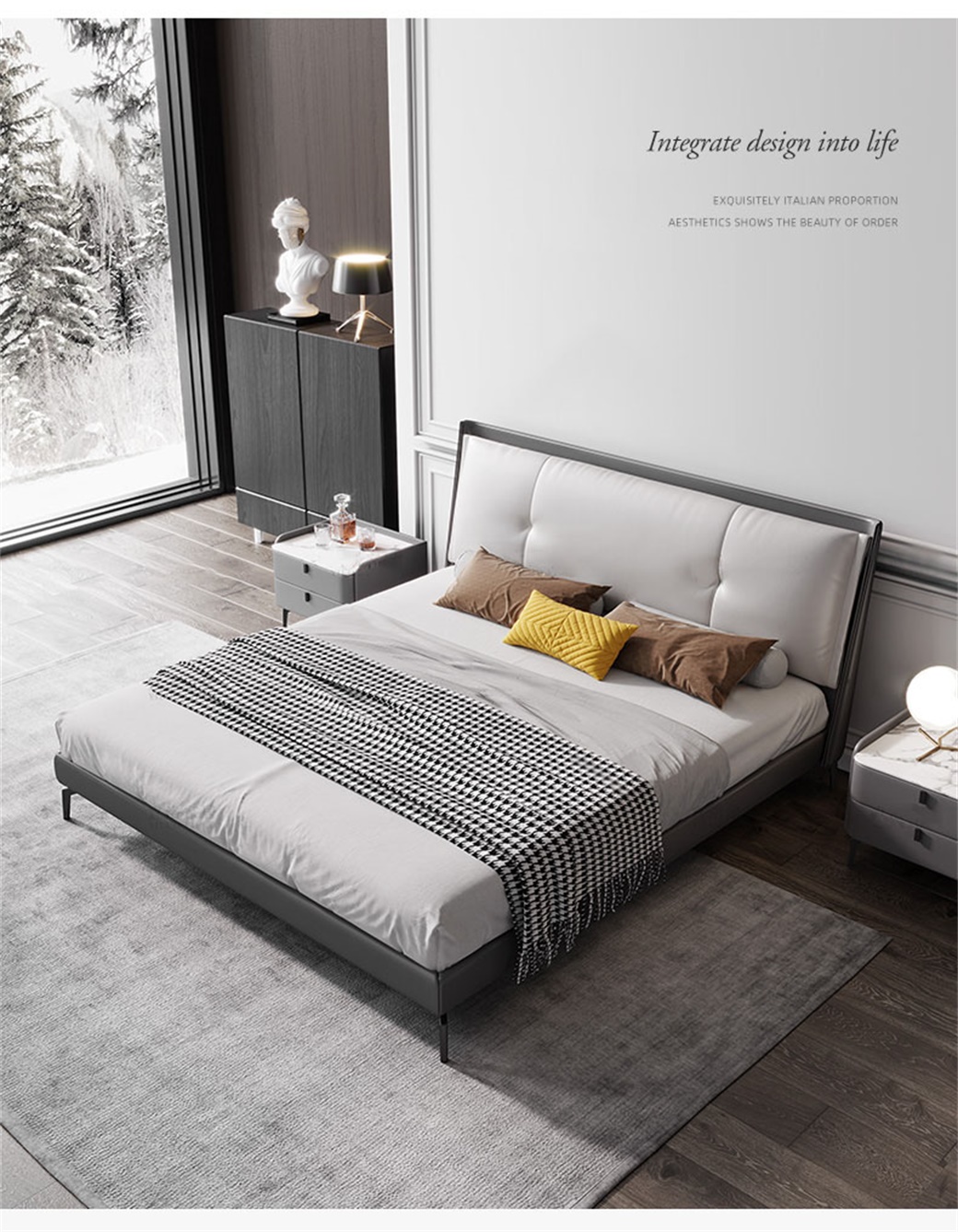 【简奢家】极简 接触面仿真皮+高密海棉+鹅绒靠包+全实木内架+碳素钢脚 1.8米床