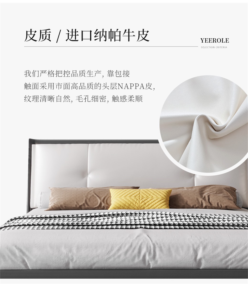【简奢家】极简 接触面仿真皮+高密海棉+鹅绒靠包+全实木内架+碳素钢脚 1.5米床