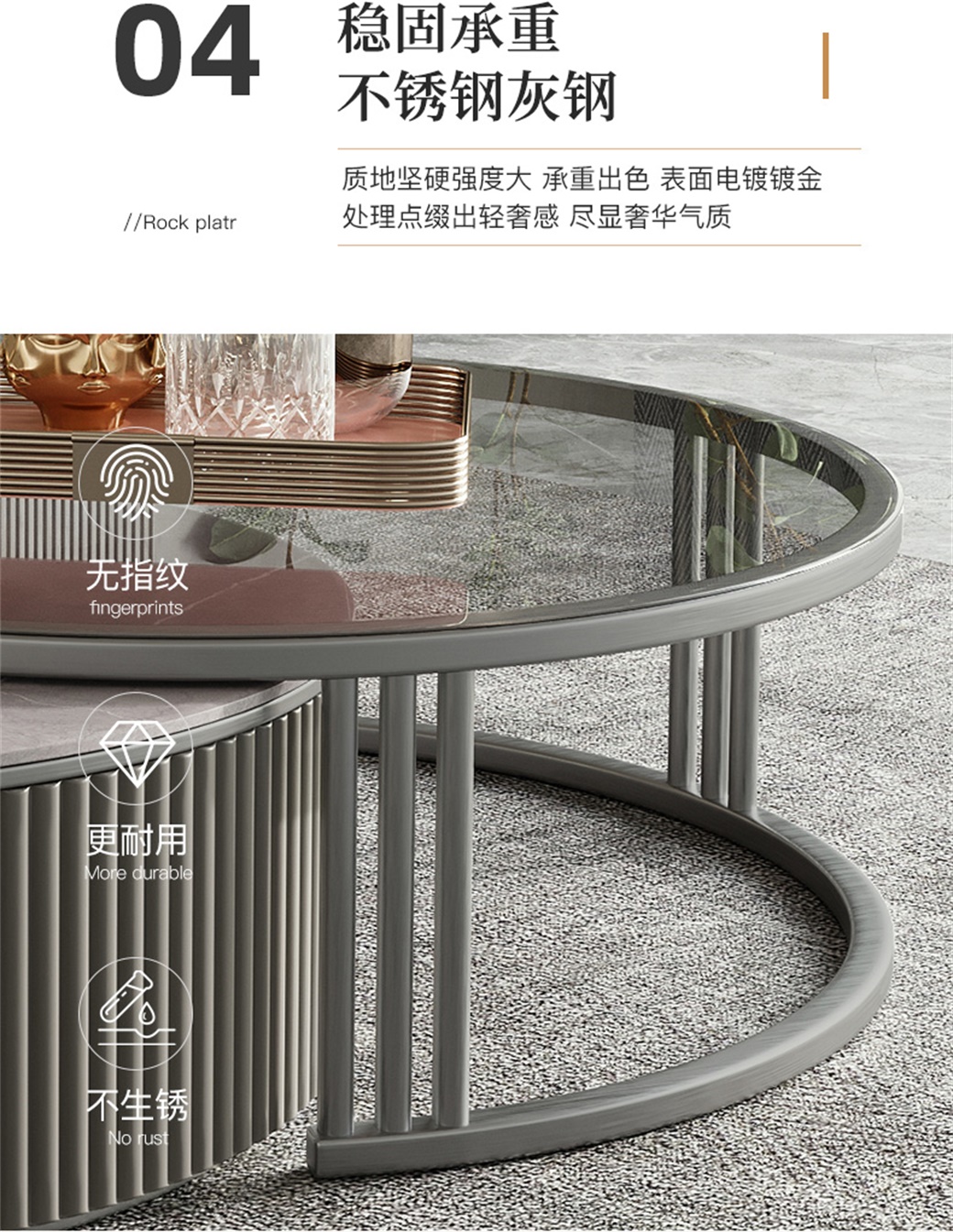 【简奢家】极简 透明灰色玻璃+岩板+浮雕工艺+钢琴烤漆高级灰+不锈钢灰钢 茶几组合