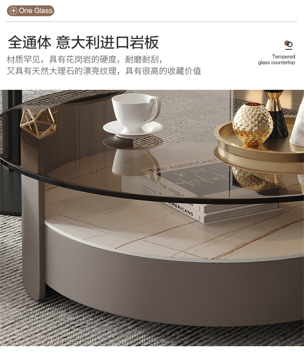 • 岩板+E1级高密度板+钢琴烤漆+茶几玻璃+感应灯