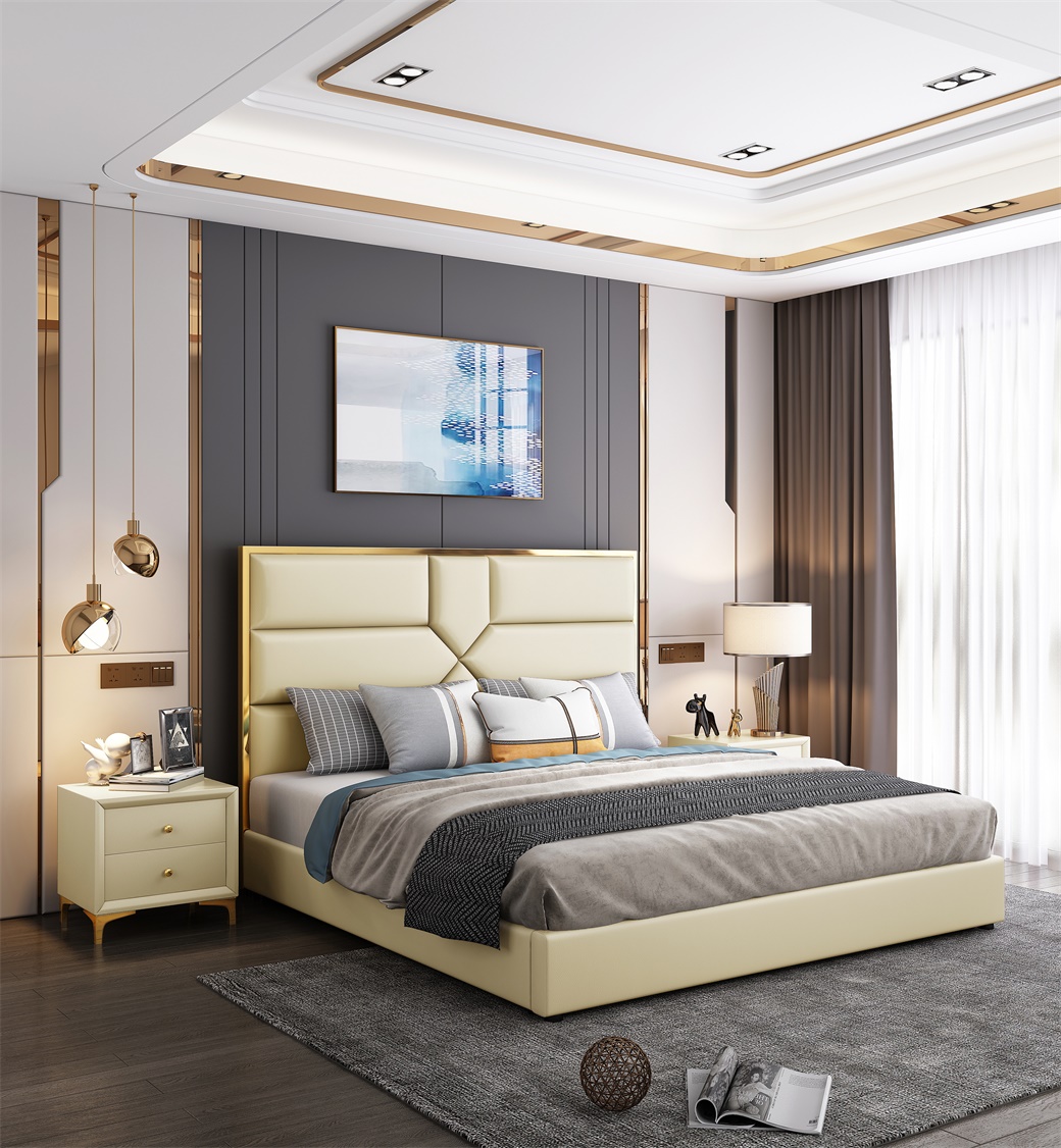 • 面料:金刚皮+靠包填充:海绵+框架:桉木+标配床板:排骨架A床板