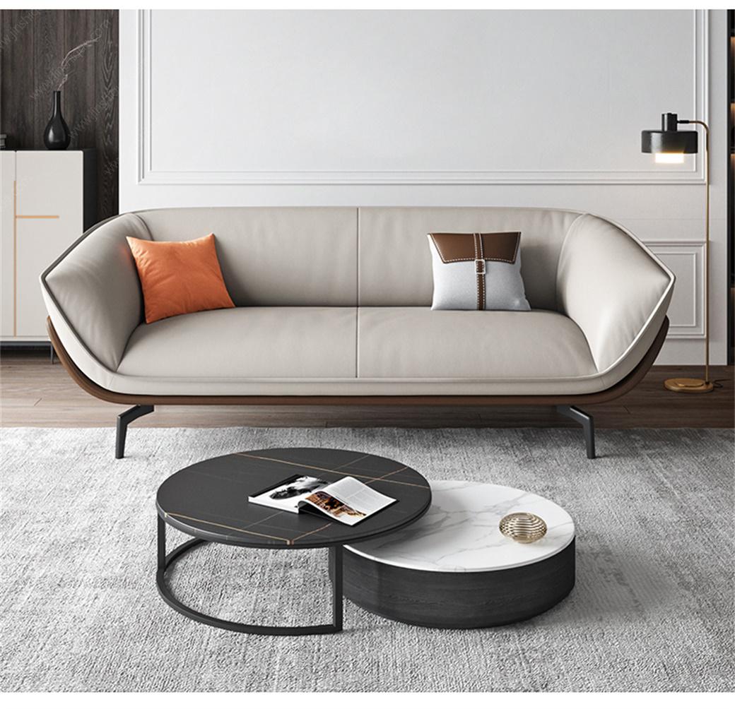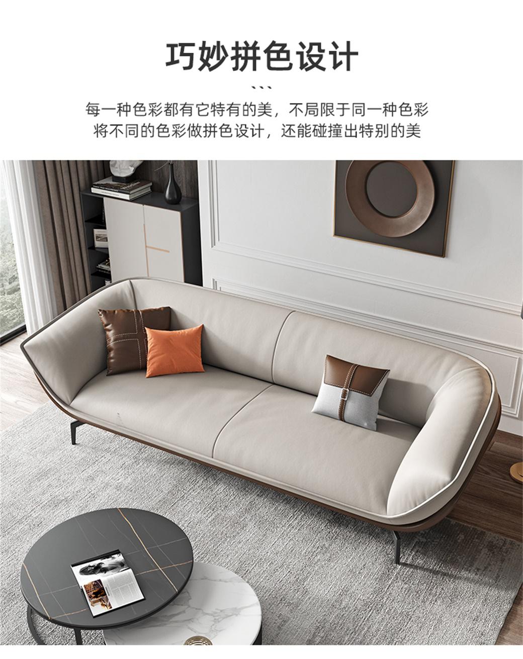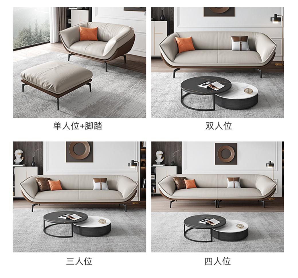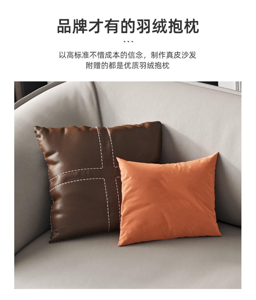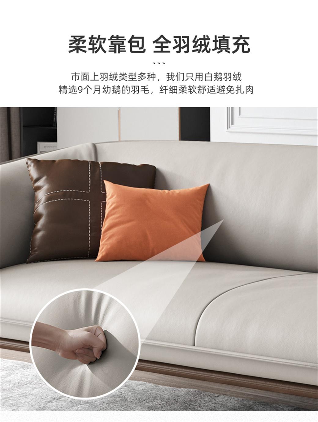 • 接触面仿真皮+高密度海棉+白鹅羽绒靠包+全实木内架+碳素钢脚