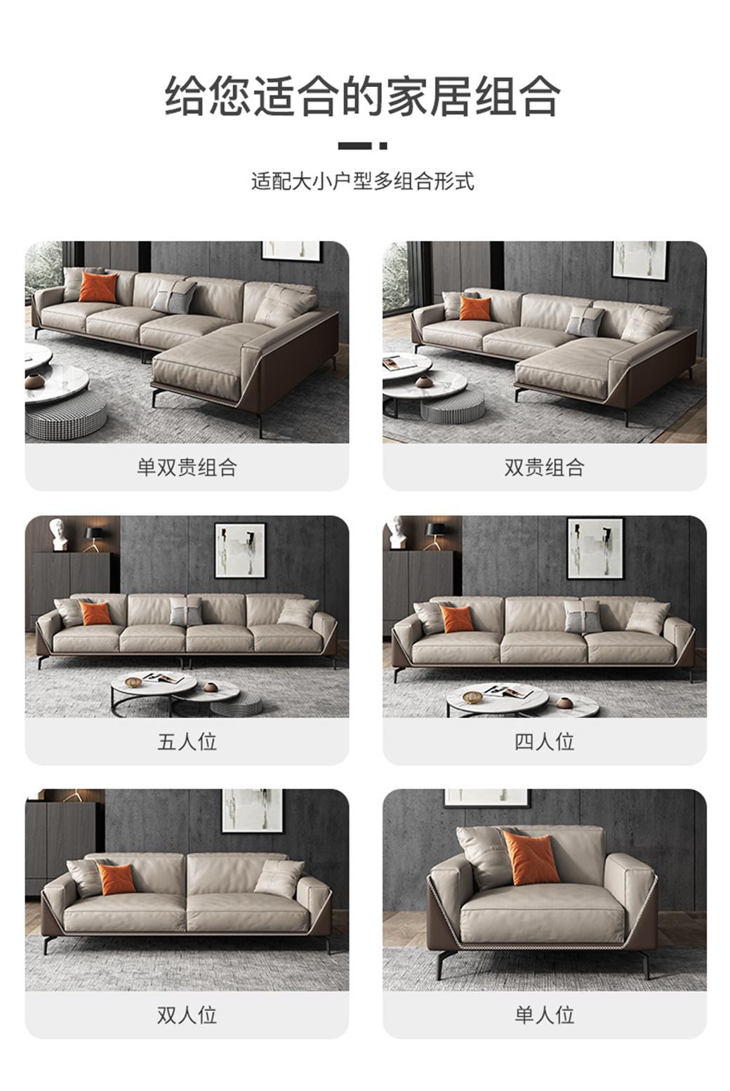 • 接触面仿真皮+高密度海棉+白鹅羽绒靠包+全实木内架+碳素钢脚