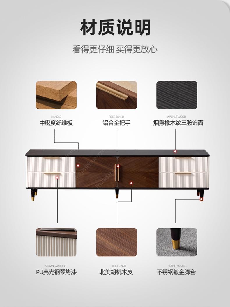 材质:环保级中密度纤维板贴北美胡桃木皮+PU亮光钢琴烤漆面+.优质实木脚